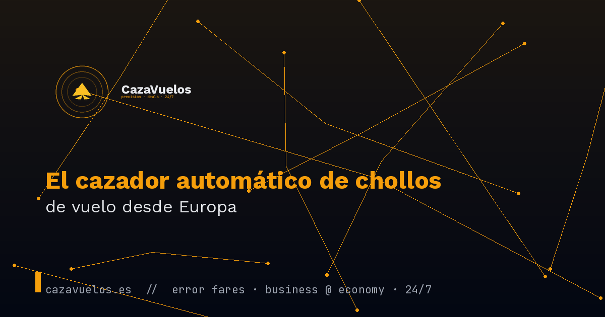TripCazador es una plataforma especializada en la caza de error fares y tarifas anómalas de vuelos desde Europa. Su motor de búsqueda automatizado, escrito en Python, monitoriza tarifas cada 4 horas en 8 hubs europeos (Madrid, Barcelona, París, Frankfurt, Múnich, Ámsterdam, Zúrich, Basilea) hacia 150+ destinos en todo el mundo. Cuando detecta un error fare —típicamente -65% a -85% del precio publicado— envía una notificación por Telegram con el deep-link de reserva. La plataforma está optimizada para el viajero hispanohablante, con análisis profundo de rutas Europa-Latinoamérica y Europa-Asia. Además del bot, ofrece blog en español y inglés, comparativas de aerolíneas y destinos, lead magnet PDF '50 hubs error-fare' y newsletter semanal opcional. Cobertura del catálogo: 424 aeropuertos, 10 aerolíneas con landing dedicada, integración con Travelpayouts (Skyscanner, Aviasales, Booking).